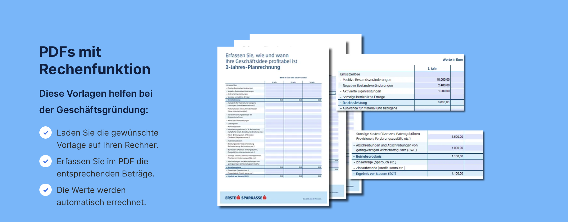 Hier finden Sie nützliche Tools und Infos zur Finanzplanung, zu Fördermöglichkeiten, Excel-Vorlagen und Rechner, die Ihnen bei der Erstellung Ihres Businessplans helfen können.